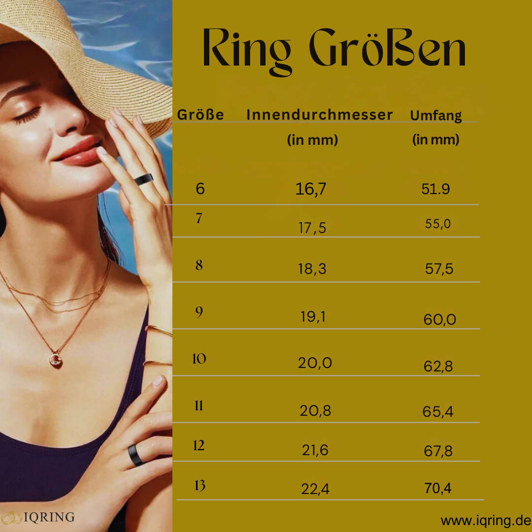 Finde die passende Größe für deinen IQRing mit unserer Größentabelle. Falls du unsicher bist, bieten wir ein kostenloses Überprüfungs-Set, damit du die ideale Passform testen kannst.